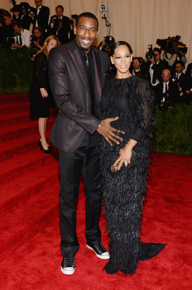 Amare Stoudemire and his wife were one of the first to be spotted on the red carpet. He in an iridescent blazer and sneakers, she in a black feather-adorned maternity gown.